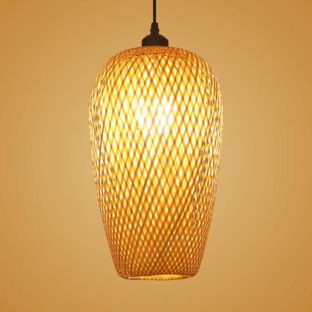 Elevate your decor with this elegant rattan lampshade. Its unique shape and intricate weaving create a captivating light show that will transform any space. Size Height 14 inches Dia 7 inches The package comes with the complete fixtures the metalic plate the holder and the wire.