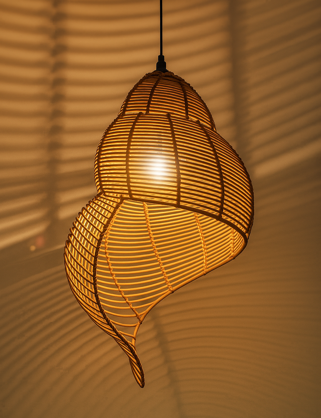 Elegant Pendant Lamp, meticulously crafted from natural rattan cane, evokes the beauty of a seashell with its intricate woven design. It casts a warm, inviting glow, adding a touch of coastal charm to any space.