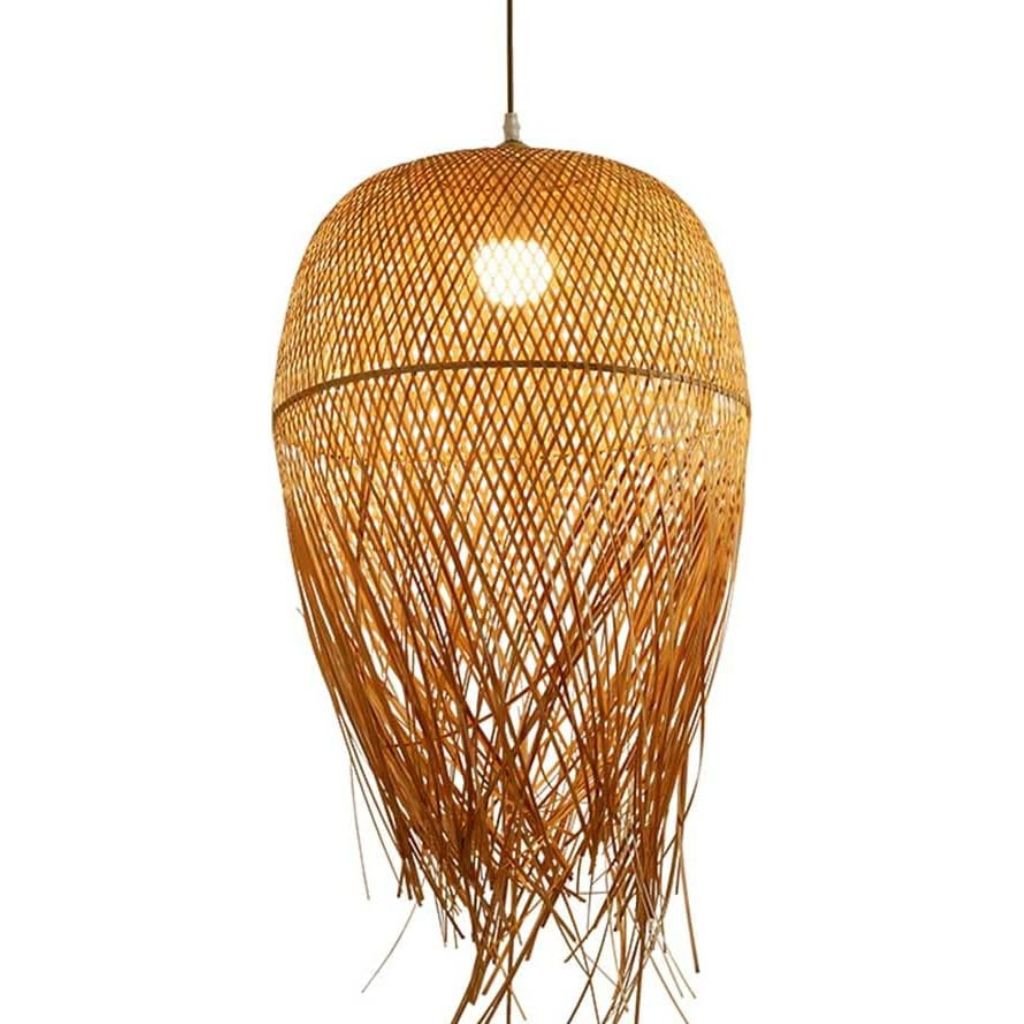 This captivating bamboo lampshade features a unique fringed design, casting a warm and inviting glow that brings a touch of the tropics indoors Size Height 20 inches Dia 12 inches The package comes with the complete fixtures the metalic plate the holder and the wire